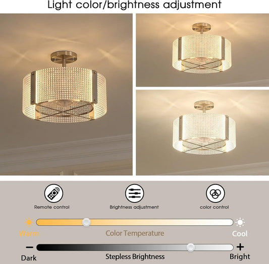 Ceiling Fan with Light Flush Mount Modern, Small Low Profile Boho Ceiling Fan with Light Remote Control, Crystal Caged Ceiling Fan with Smart Lighting /6 Speed/Timing for Bedroom Living Room(Gold)