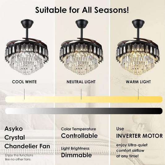 Crystal Retractable Chandelier Ceiling Fan, Retractable Ceiling Fans with Lights Remote, Dimmable with Memory Function,Crystal Fandelier Ceiling Fans for Living Room, Bedroom, Dining Room (42")