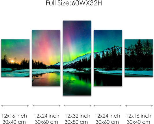 Aurora Borealis Canvas Wall Art Northern Lights Canvas Print Painting for Living Room Snowy-Mountains-Landscape Poster Picture Wooden Framed Prints Ready to Hang (60Wx32H, Aurora Borealis Decor17)
