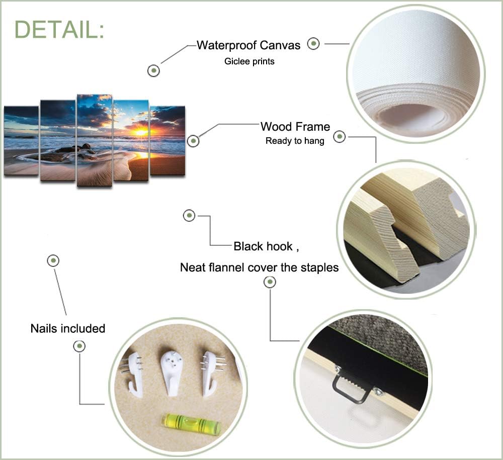 - Each panel canvas art has a black hook already mounted on the wooden bar ready to hang out of box